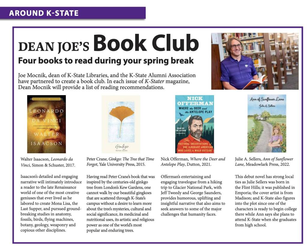 Dr. Joe Mocnik, Kansas State University’s Dean of the Libraries, selected Ann of Sunflower Lane for his book club recommendations.